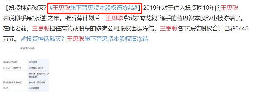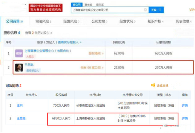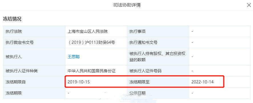 现在他拿5亿“零花钱”练手的普斯资本股权也被冻结了。据相关网站查询数据显示,由王思聪担任董事长并持股100%的北京普思投资有限公司(简称“普思资本”)股权遭到上海市宝山区人民法院冻结,具体冻结数额不祥,冻结日期自2019年10月15日起至2022年10月14日。