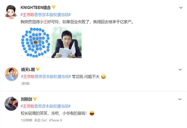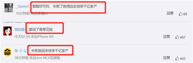 王思聪5亿变成50亿的投资神话破灭,但是网友们却纷纷表示:“聪聪好可怜,失败了就得回去继承千亿家产”,“都说了是零花钱”,“校长轻蔑的笑笑,冻吧,小爷有的是钱!”