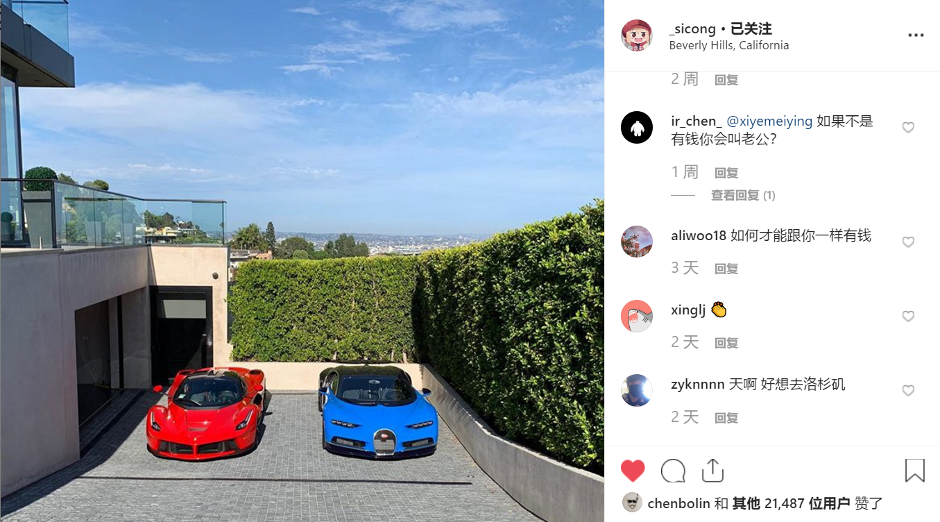 王思聪的生活一直都很是潇洒惬意,此前他在社交软件上晒出了在洛杉矶比弗利山庄豪宅,图中有蓝色的布加迪Chiron和红色的拉法。而校长在国内的豪车更是数不胜数,今年8月他还入手了一辆台布加迪Chiron,是大陆第二台Chiron,价值四千多万。