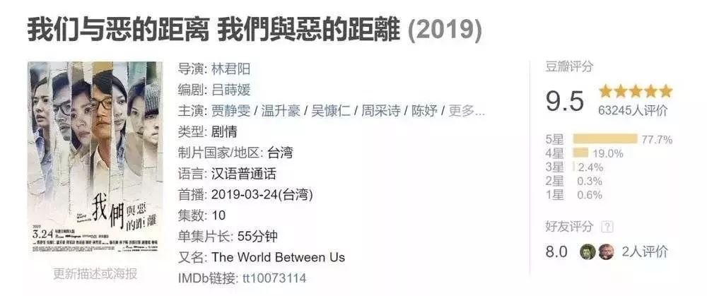 在今年,一部《我们与恶的距离》更是彻底刷新了大众对台剧的认知,引发了广泛的讨论,豆瓣更是给出妥妥的9.5高分。