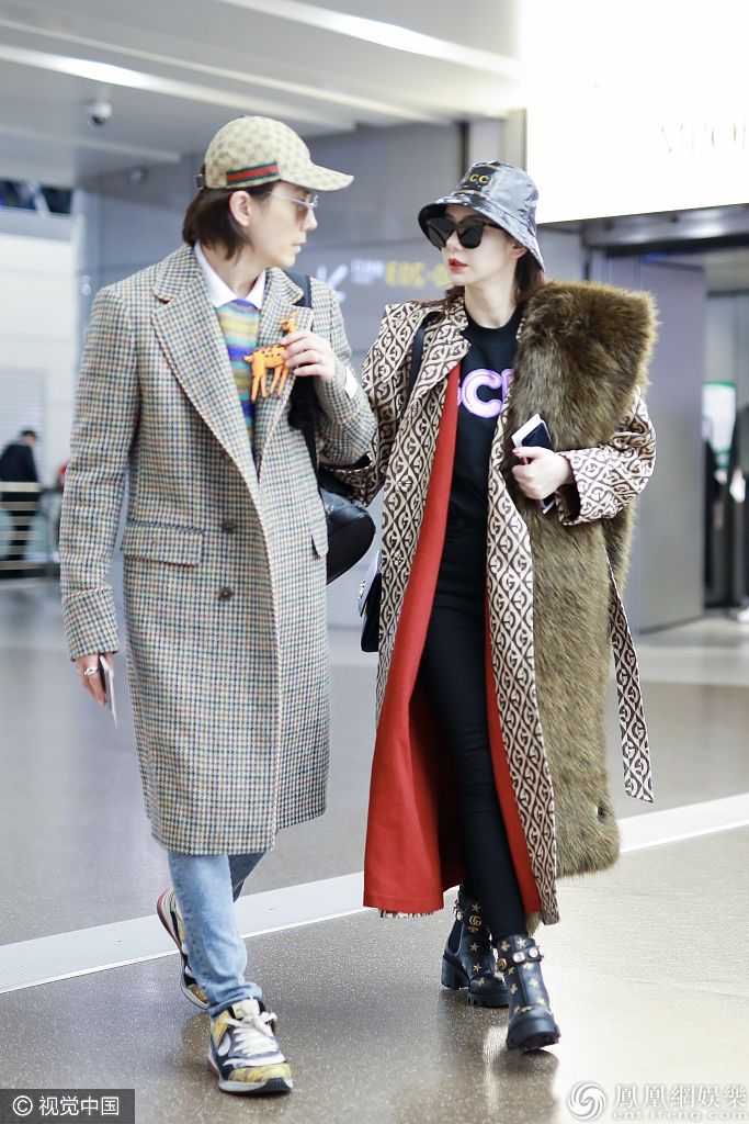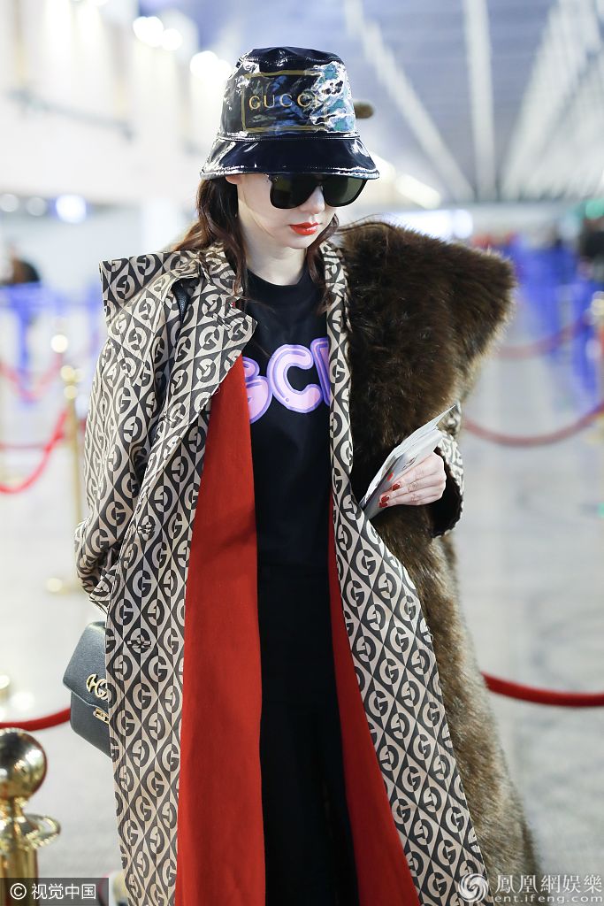 戚薇戴着皮质渔夫帽,涂着红唇戴着黑超,身穿印花红色内衬大衣肩扛皮草,造型十分霸气。 图片来源:签约供稿人/视觉中国