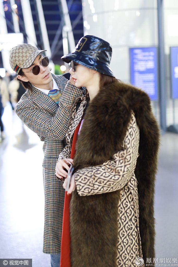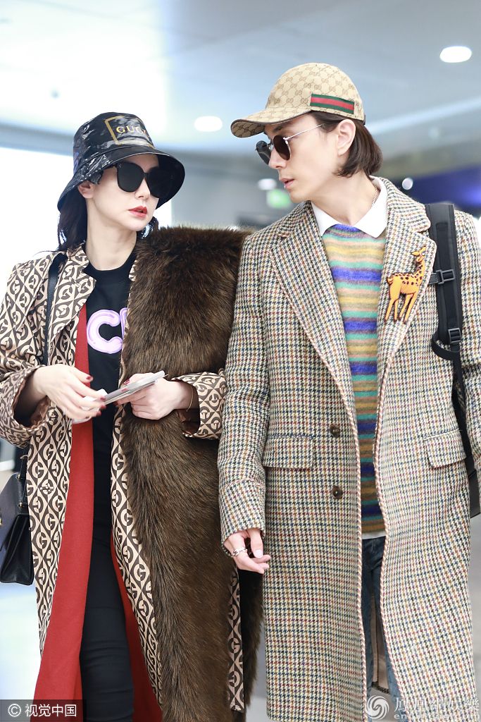 李承铉戴着印花棒球帽身穿千鸟格长风衣紧紧跟随娇妻。 图片来源:签约供稿人/视觉中国