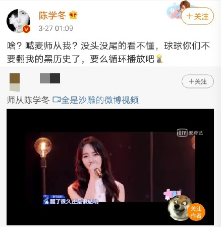 随后陈学冬在评论中解释称,“我没看到后面,那个...姑娘对不起...”在删除了转发后,陈学冬又发博回应道:“那个…你们要学习喊麦可以单独拿我的喊麦视频教学…错了…溜了溜了,老年人心脏吃不消”,引网友捧腹。