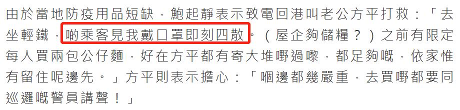 留在英国陪女儿的鲍起静,此前还因为物资短缺而致电回港向老公方平求救,接受媒体访问时,她透露:“搭乘地铁时,其他乘客见到我戴口罩立即四处散开!”被问及家中储备粮是否充足,她称之前有限定每人买两包车仔面,好在老公方平也寄了很多食物给她们母女,目前三餐不用担忧。