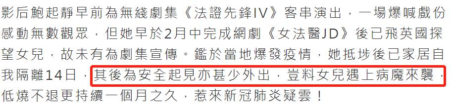 据悉,鲍起静在今年二月中旬还参与了网剧《女法医JD》的客串拍摄,之后就立马赶往英国陪伴女儿,不料这一去就返港之日遥遥无期,期间还经历了女儿生病却遭医院拒收的煎熬,网友们都担心年事已高的她撑不住,纷纷留言为她加油打气!
