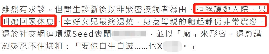 幸好女儿最终退烧恢复健康,但是鲍起静依然十分震怒,70岁的她在社交平台上控诉当局者,越讲越激动,最后更是忍不住爆粗口:“要你自生自灭…xx。”想来女儿低烧一个月却遭医院无情拒收,让她的内心十分煎熬,现在才会如此愤怒。