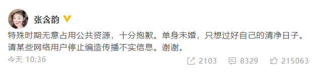 不过张含韵很快就发文否认”特殊时期无意占用公共资源,十分抱歉。单身未婚,只想过好自己的清净日子。请某些网络用户停止编造传播不实信息。谢谢。“