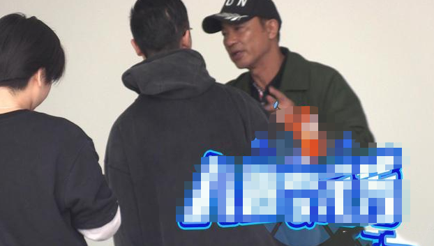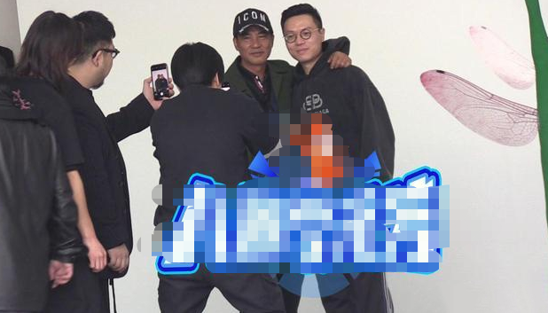 任达华和工作人员们站在白色的背景幕布前合影,相谈甚欢。