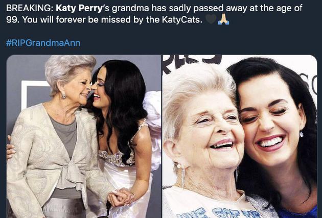 据外媒,“水果姐”凯蒂·佩里(Katy Perry)的祖母Ann Hudson于妇女节当天去世,年享99岁。另外,祖母去世前已经得知孙女怀孕的好消息,但是没有机会看到重孙(女)出世了。