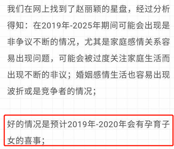 除了这些出轨、被绿的事情外,莫小棋还预言过一些明星的运势。比如,她曾经对赵丽颖的星盘进行分析,预言她在2019年-2020年会有孕育子女的喜事。