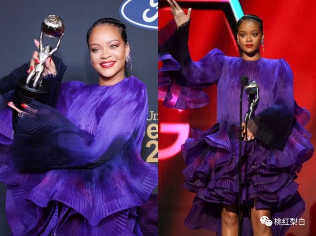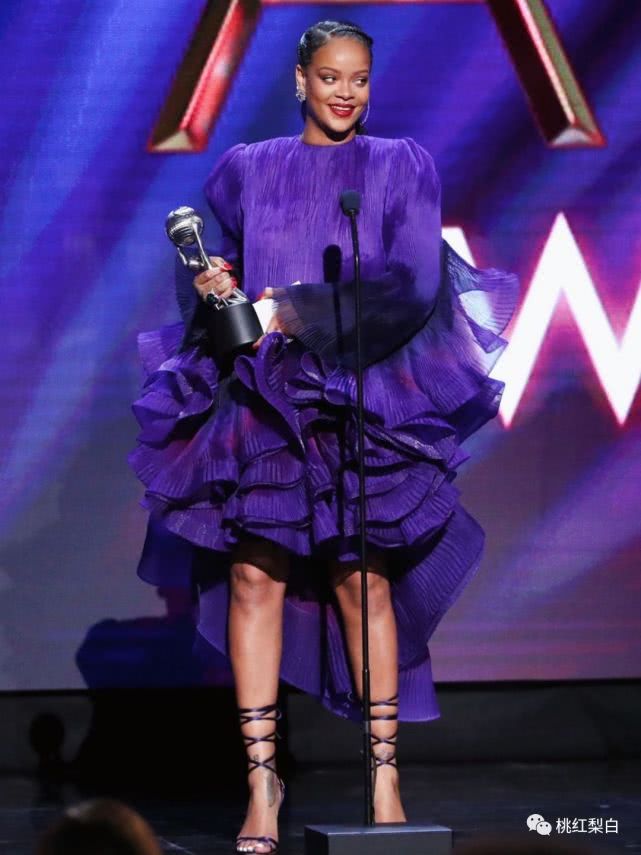 刷微博的时候,有被蕾哈娜这一身look美到。 参加2020年有色人种民权促进协会形象奖,选了Givenchy充满造型感的深紫色高定礼服裙,层叠的裙摆和相对宽松的款式,真的特别能增加蕾哈娜的气场,配合霸气有力的发言,锦上添花。 最近的另一身look,也很亮眼: