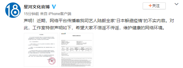 3月9日,陆毅工作室发文回应陆毅全家“日本躲避疫情”的不实言论,称:近期,网络平台传播着我司艺人陆毅全家“日本躲避疫情”的不实内容。对此,工作室特做声明如下,希望大家不信谣不传谣,维护健康的网络环境。