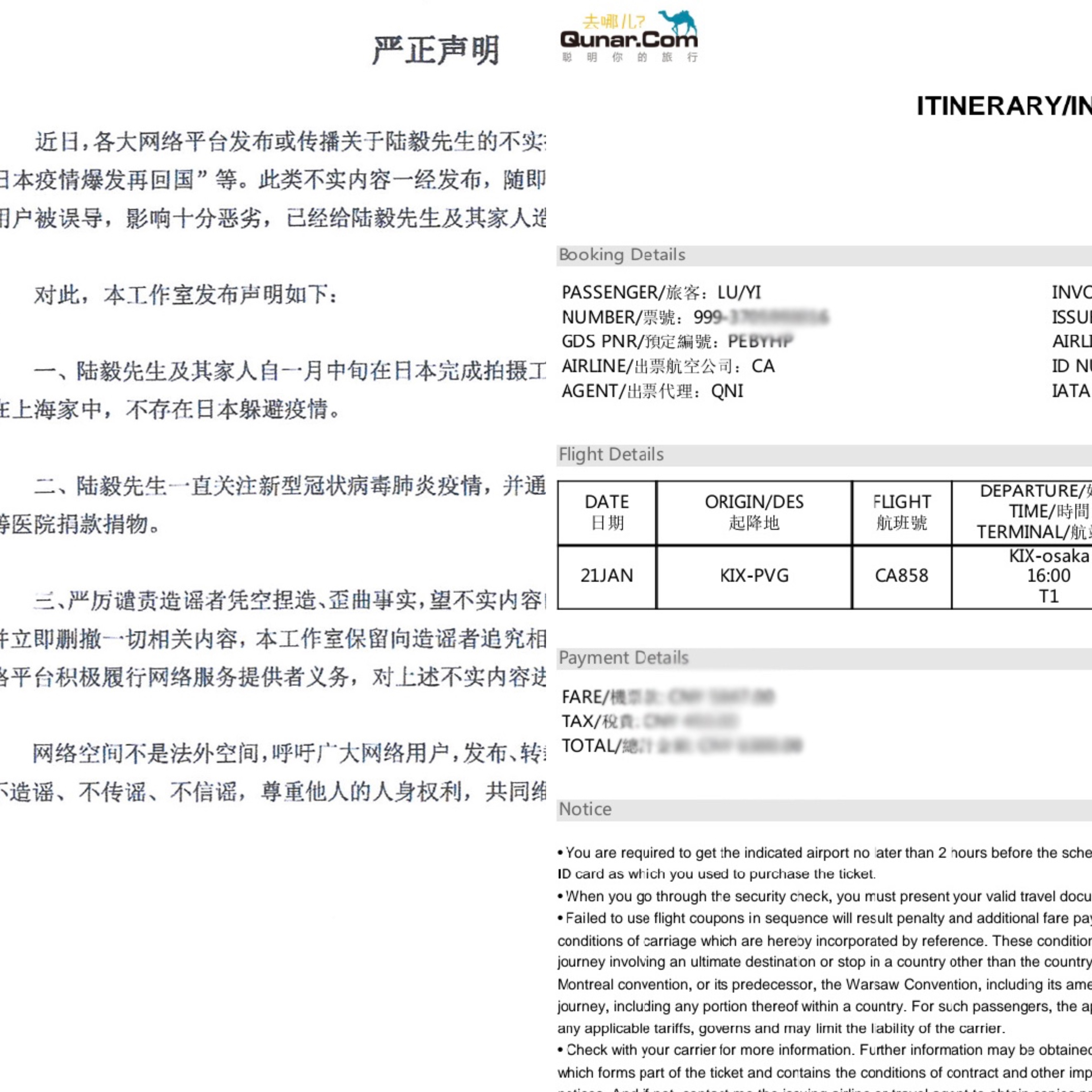 从工作室发布的机票证明可以看出,陆毅于1.21就已返回中国,不存在在日避疫的情况。而且,陆毅也心系疫情,通过上海宋庆龄基金会给武汉、上海等医院捐赠医疗物资。
