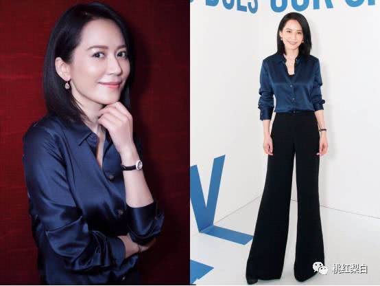 最代表性的一身是参加兰蔻发布会:蓝色丝绸衬衣,黑色阔腿裤,简简单单,白皙的胳膊上只有一款钻石腕表。