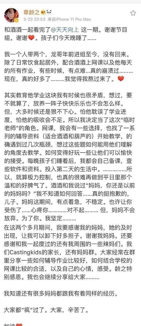 近日,章龄之带着两个儿子酒酒和葫芦参加了《天天向上云时间》,因为丈夫陈龙在横店剧组未能回家,一直都是章龄之独自在家照顾两个孩子。而整个宅家期间,章龄之的教育方式也是受到网友的广泛关注,她随后也大方发博分享育儿经验。