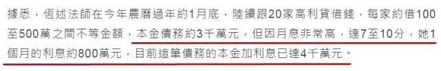 根据台湾媒体的报道,在1月份时,她陆续跟20家高利贷公司借钱,截止到目前为止,这笔债务本金加上利息已经达到929万人民币(约4000多万台币)。