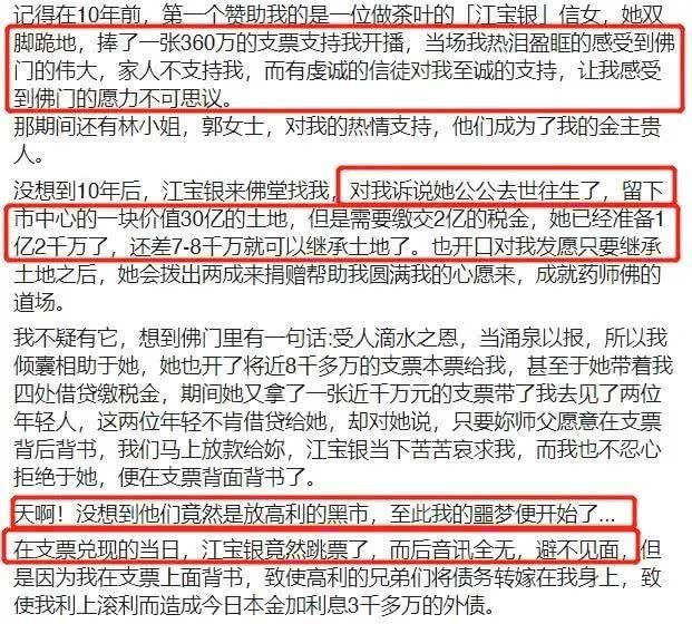 其实费贞绫在出家以后,因为弟弟的名气太高,而化不到缘,当时得到信女江宝银的赞助。只不过万万没想到这位江宝银是个骗子,骗她欠下了一张巨额高利贷的支票,她就消失了,而债务就转移到了费贞绫的身上。