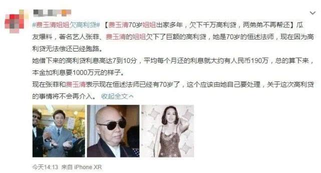 其实这也不是弟弟们绝情,毕竟姐姐费贞绫已经不是第一次被爆出这样的新闻了。早在去年的时候,弟弟们就帮她还过一次2000多万的外债,但没想到她不吸取教训,又重蹈覆辙了。