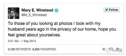 面对自己的裸照被曝光在众人面前,女星Mary Elizabeth Winstead在推特上发言:“那些我和我先生过去拍过的亲密照,希望你们看的还舒服!”