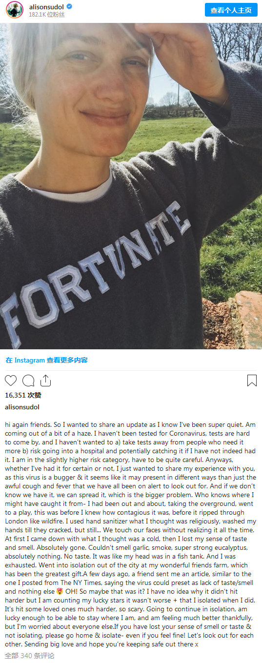 她表示此前不知道新冠传染性那么强,前阵子在伦敦四处活动,虽然有认真用洗手液洗手,但此后伦敦新冠肺炎疫情爆发,她还是疑似感染了。她先是出现了感冒一样的症状,然后完全失去了嗅觉和味觉,大蒜、烟雾之类的气味都闻不到,“就像我的头被塞进了鱼缸一样”,并且感到很疲惫。直到看到朋友发来的一篇文章,说新冠的症状包括没有味觉和嗅觉,她才意识到自己可能感染了。