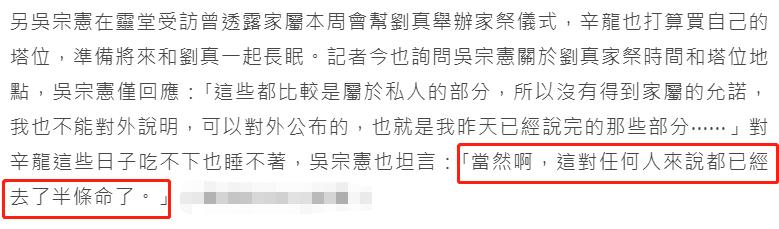 关于辛龙近日吃不下也睡不着一事,网友们都很担心,记者向辛龙的老板吴宗宪问起此事,吴宗宪坦言:“当然啊,这对任何人来说都已经去了半条命了。”