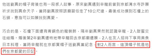 据辛龙透露,这顶帽子背后也有一个感人的故事。原来在刘真遇到辛龙之前,曾经前往京都某寺庙许愿祈求真命天子,当时刘真非常诚心地按照庙里习俗走了10米,然后成功摸到石壇上的石头,意指可以如愿找到真爱。