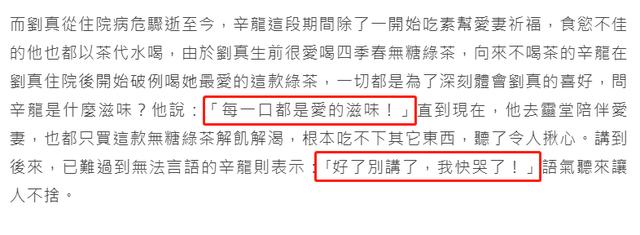 而且辛龙婚后对刘真,是宠她爱她,体贴到羡煞旁人。在爱妻入院治疗期间,辛龙相当煎熬,为了体验刘真的喜好,一向不爱喝茶的他破例开始喝起了刘真生前最爱喝的茶饮,并表示每一口都是爱的滋味!辛龙还透露,除了这款茶饮他几乎吃不下东西,听了令人很揪心。