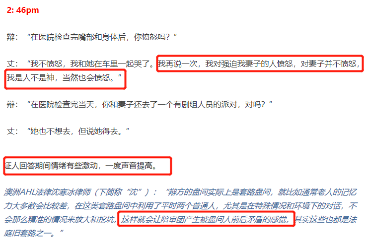 显然当事人的丈夫有被律师的盘问所影响,在多次询问之后,说话的音量有明显提升,情绪略显激动,不知道陪审团对这样的表现是否会纳入最后的评判中。