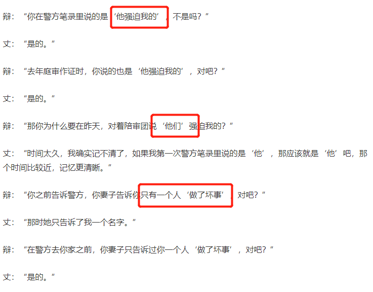 而且在庭审中,辩方律师一直都在寻找各种各样的陷阱,让当事人丈夫情绪激动。其中面对前后不一致的问题上,辩方进行了着重的盘问,因为之前他在警方的笔录中说到是“他强迫我的”,不过在昨日的陈述中,他却说出了“他们强迫我的”。