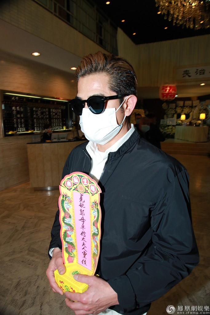 郭富城戴着墨镜手捧母亲灵位率先步入殡仪馆。