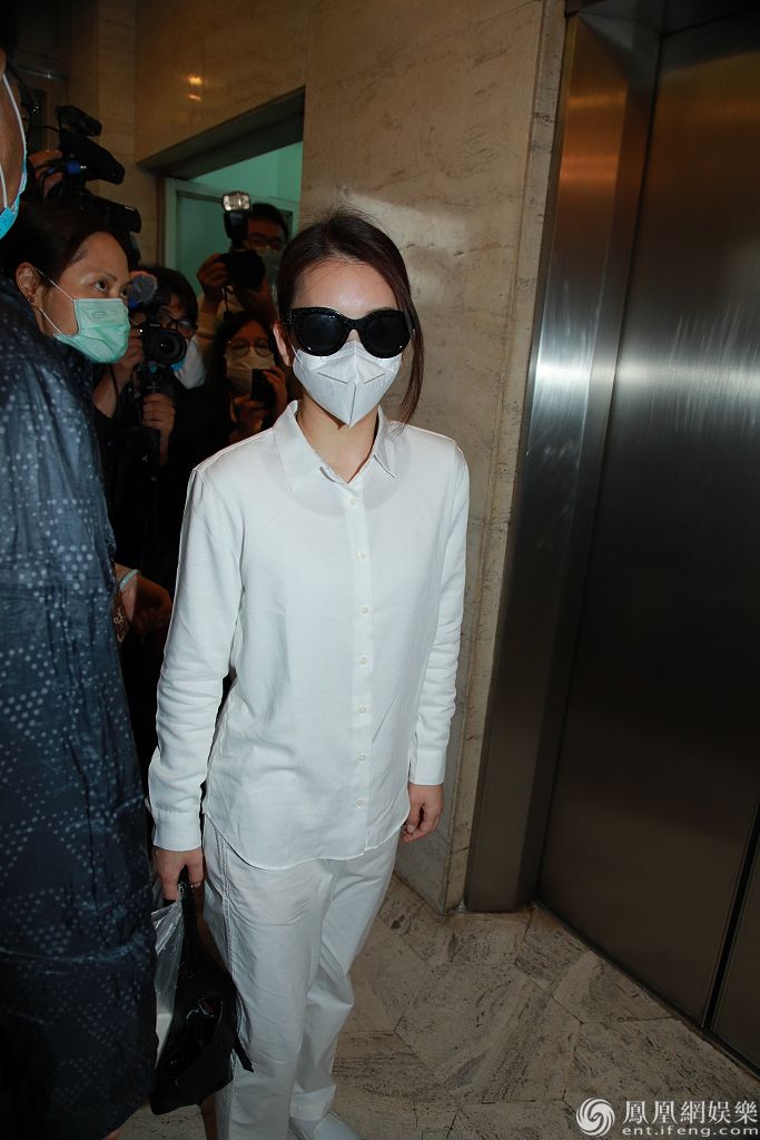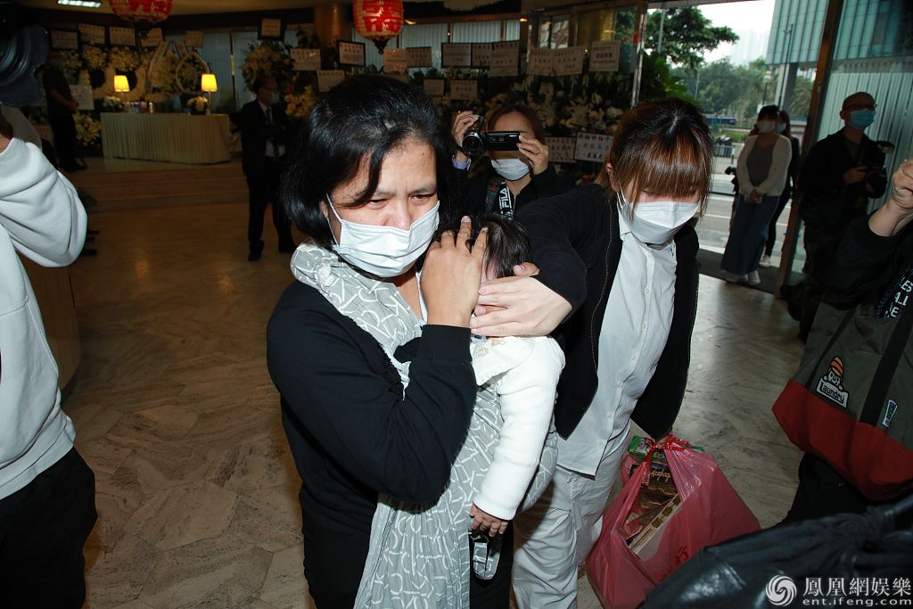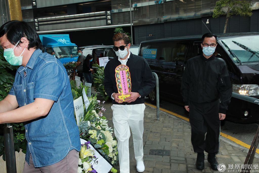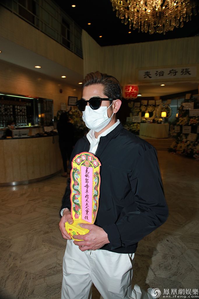 下午三时半,郭富城戴着墨镜手捧母亲灵位率先步入殡仪馆。