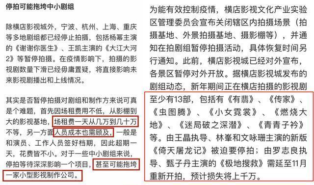 包括王一博、赵丽颖的《有翡》,女神的复出之作一时间难以和大家见面,也引来不少粉丝大呼可惜,当时在横店拍摄的影视剧还有林峰的《倚天屠龙记》、《虫图腾》《小女霓裳》《燃烧大地》《青青子衿》等等,甄子丹主演的《极地搜救》也需要延至11月重新开拍,据说损失也达到了上千万。
