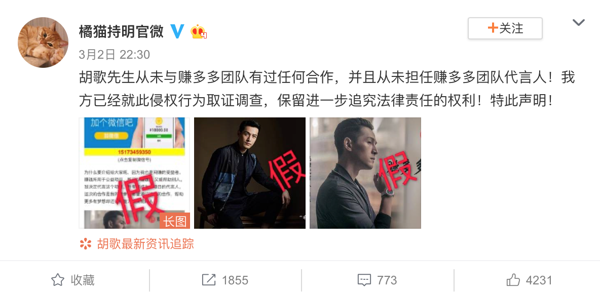 3月2日,胡歌方就此事通过社交平台发文打假,否认与该团队有过任何合作,从未担任该团队代言人。“我方已经就此侵权行为取证调查,保留进一步追究法律责任的权利!特此声明!”