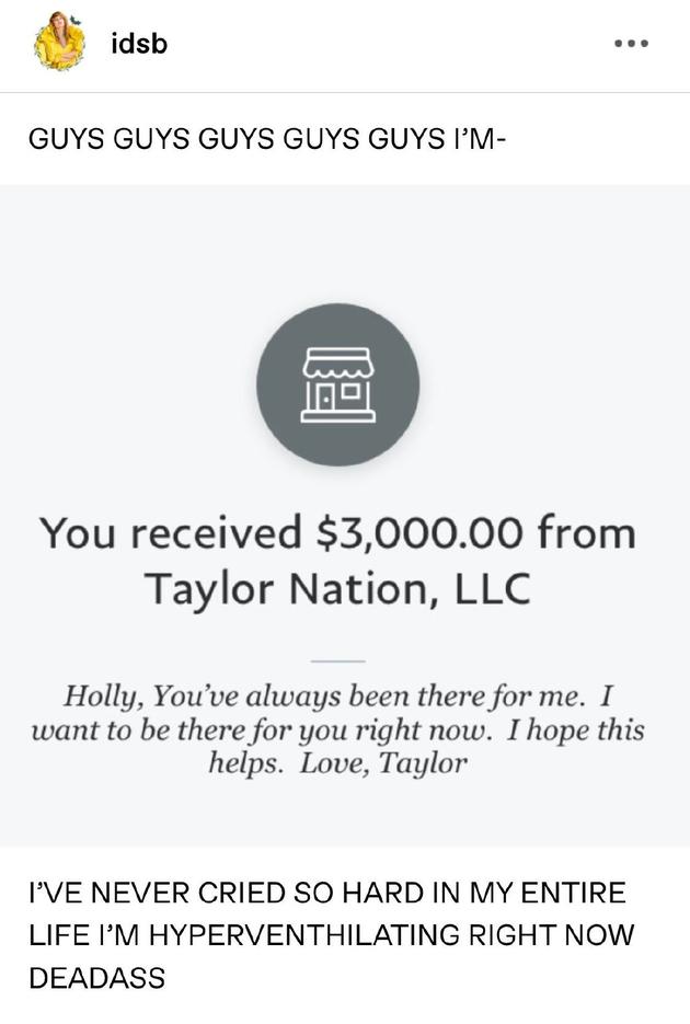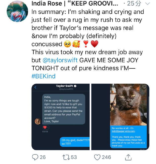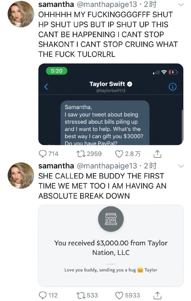 近日,“霉霉”泰勒·斯威夫特(Taylor Swift)连续向多位因新冠肺炎疫情影响生活工作,陷入经济困境的粉丝捐助了3000美金。有粉丝将个人情况发布在社交网站上,霉霉看到后便私信粉丝要了支付账号。