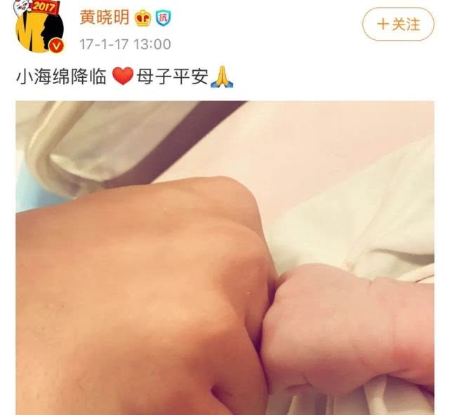 2017年,Angelababy 1月产子,黄晓明没有单独在baby生日的时候发布祝福,只是在小海绵出生的时候,发出了父子俩的拳头合影。