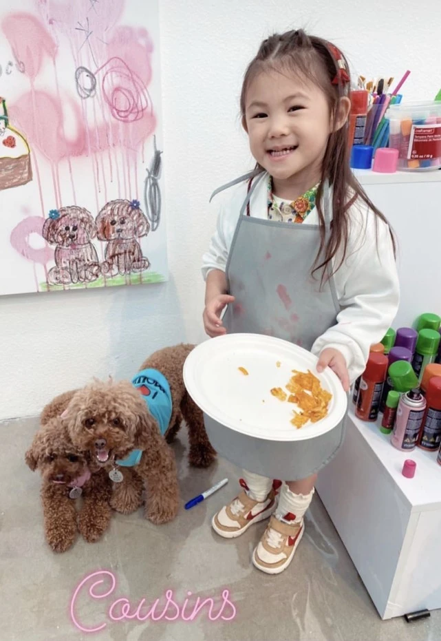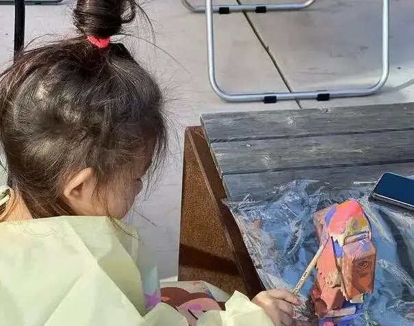 派对现场还提供了很多画画的工具和颜料,Alaia与几位小伙伴都穿戴着围裙准备大展身手。