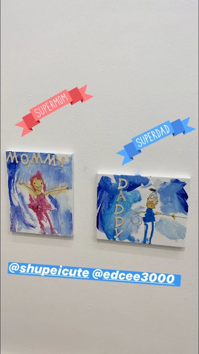 除了这两张爸爸妈妈的画像,陈冠希姐姐陈见飞也在社交网秀出了多张Alaia的画作,并写上“Alaia’s first art show”,看来,陈冠希和秦舒培是把女儿3岁生日派对打造成她的画展。