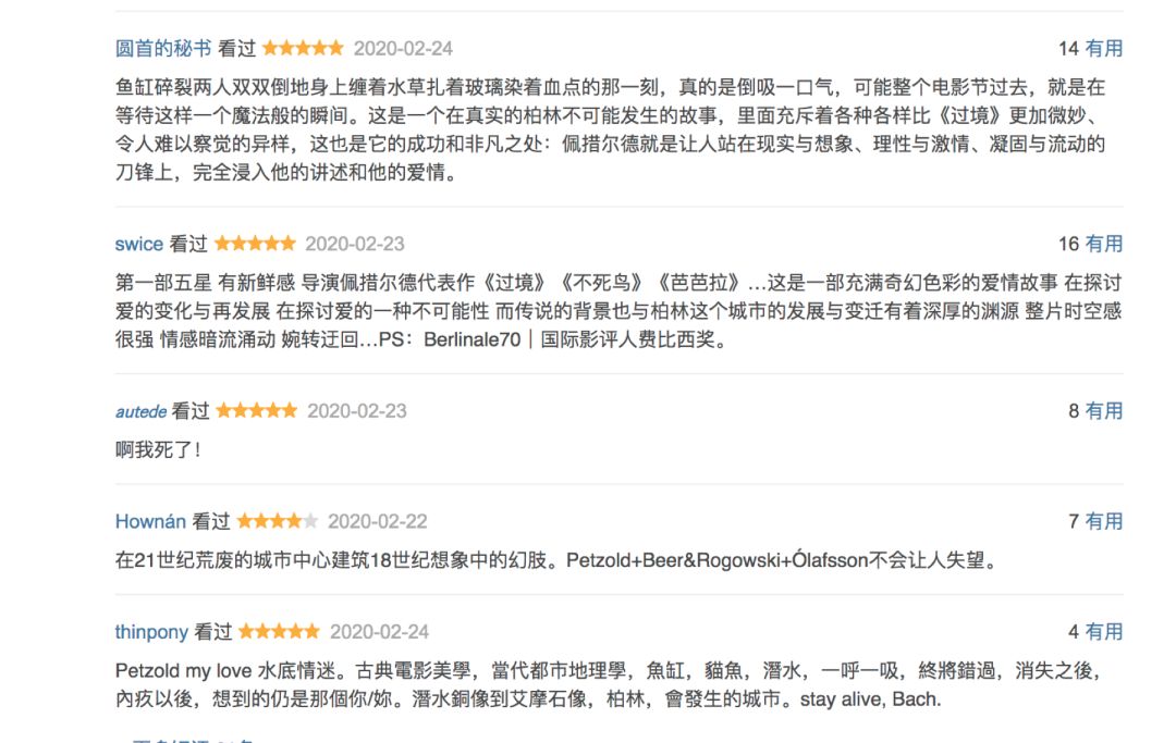 和这部《温蒂妮》类似,那两部作品里就充满了情节剧(melodrama)式的戏剧化情节和冲突,同时兼具有对德国战后重塑的创伤性反思。整个影片基调就有一种德国冷峻叙事伴随的滚烫人情温度。