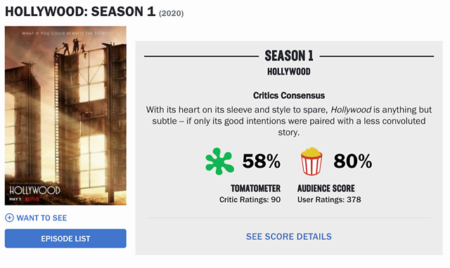 《好莱坞》也没能实现翻盘,上线之后媒体好评率只有58%,没能及格(好在观众还是比较捧这个剧,80%爆米花度)。