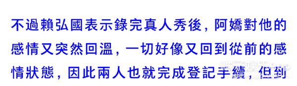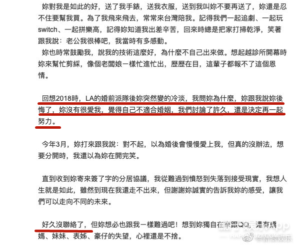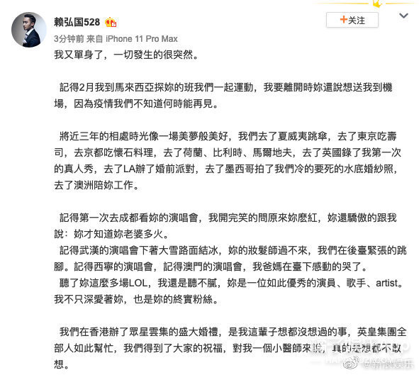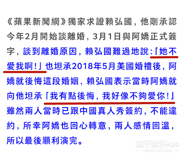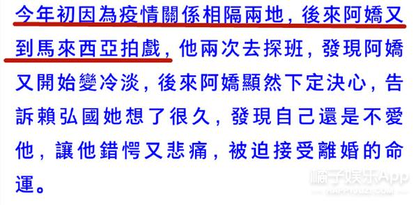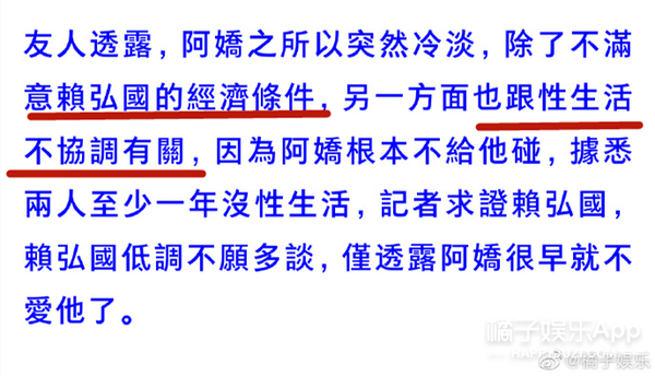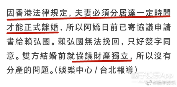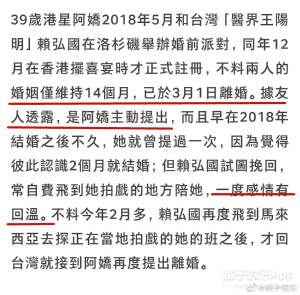 阿娇离婚了?! 据台媒,阿娇与赖弘国已在今年3月1日离婚↓ 两人于2017年10月公开恋情, 2018年12月结婚, 婚姻仅维持14个月。 据了解,离婚是阿娇主动提出, 这还不是第一次, 早在两人结婚后不久她就提过一回↓ 提及理由,男方的回答是: “她不爱我啊” 女方友人给出的原因有两个↓ 1、不满赖弘国的经济条件 2、性生活不协调 之所以俩人没在第一次发现问题时离婚, 是因为当时有档国内真人秀找他们, 拍完之后,夫妻俩的感情又回温了↓ 直到今年年年初, 因为疫情分隔两地的关系, 他们最终还是签了协议↓ 目前的情况是↓ 因为他俩在结婚前就协议“财产独立”, 所以他们只需等待香港法律规定的“分居达一定时间”就算正式解除夫妻关系了↓ 消息曝光后, 阿娇通过公司做出了回应: “双方已经签了分居协议” 男方自己在微博发了长文↓ 本来想画个重点,但发现全文翻来覆去都在说同一个意思: “我还爱着你但突然‘被’离婚了,如果重来一次,我还是会跟你结婚” ??? 太突然了! 没记错的话, 两人3月份还在微博互动来着。 3月1日签的字, 3月5号,男方还能评论阿娇微博说:“老婆加油,爱你”↓ 3月14日白色情人节,赖弘国还晒了婚纱照,配文:“白色情人节快乐”↓ 3月18日,阿娇转发赖弘国微博:“等一下我去支持你。”↓ 合着婚都离了,微博上还在假装营业? 明明故事的发展不是这样的↓↓↓ ------------我是回忆阿娇恋情的分界线---------- 阿娇的老公,现在应该叫前夫,赖弘国, 今年35岁,在台湾号称“医界王阳明”, 之前在陈怡蓉老公薛博仁的医美诊所任职,是一名整形医生。 因为职业的特殊性,他上过《康熙来了》,之后更是人气暴涨。 身材也是非常棒了。 ins上的各种旅游照能看出品味和生活品质都不错。 两人是通过朋友介绍认识的,赖弘国一开始其实不知道阿娇是谁,虽然知道TWINS,知道有阿娇这个艺人,但不知道她长什么样。 而阿娇对赖弘国的初印象很简单:年轻的医生中,很少有这么帅的~ 刚开始认识时,因为赖弘国喜欢健身,是那种很有肌肉的型男,阿娇还嫌他整个人太高大,并不是自己理想的类型,自己也不想谈一段没有结果的爱情,但相处几个月后,被赖弘国的真诚打动。 认识3个月,秘密交往1个月,感情进展神速,2017年12月,就听说男友留宿在她家了。 新闻里说,她男友来香港的那几天,阿娇不但让男友住在自己家,更是把自己平时代步用的车给对方开。 看见记者拍照,她还对着镜头笑了笑。 但为了不让男友曝光,她没有马上上车,而是等到司机及助手走近车门位置筑起“人肉屏风”遮挡镜头,然后才小心翼翼揭开布帘上车,非常谨慎。 2017年阿sa过生日的时候,阿娇还把男朋友带过去给姐妹认识。 大家都知道,把男友介绍给闺蜜认识,那已经某种程度上的认可了吧。 公开恋爱后,阿娇说:“虽然认识的时间不是很长,但是他很关心我,令我有被爱的感觉,虽然他是一个非常忙碌的人,经常飞来飞去,就算这样,他依然十分努力地去争取互相了解对方的机会。” 恋爱曝光没多久,阿娇的这位新男友就被曝出不但有过短暂婚史,前前女友还是黑涩会美眉的混血妞suan。 在他们俩恋爱曝光的前一个月,曾和一位辣妹出国旅游,还不止一次。 不过在后来的采访中,阿娇说自己从来没有遇到过一个那么贴心、对我那么好的人。” 还帮男友说话,说每个人都有过去,恋爱最主要的就是包容、不介意。 阿娇曾经说过:“以前对爱情的看法和现在完全不同,以前有可能会列很多条件,但是如果真的喜欢一个人,你会包容他的一切,感情是可遇不可求,我觉得随缘吧!如果你真的要和一个人在一起,心态就一定是一辈子的。” 虽然很多人不看好这段恋情,但阿娇早在节目上表达了自己想要结婚的愿望,并且是不想谈恋爱,想直接结婚。 “虽然过往的情路崎岖,但我依然相信爱情,希望得到大家的祝福,希望感情能开花结果” 赖弘国也透过诊所表示:“我很喜欢她,她是很好的女生,也是我想认真走下去的对象。” 2018年2月份,阿娇在微博晒出一张戴钻戒照,宣布婚讯,并称:“这是我农历生日最好的礼物,谢谢你的爱,下一站幸福。” 赖弘国也说:“因为我不是艺人,还是希望大家给我们空间,我会努力工作带给阿娇往后的幸福,谢谢各位” 求婚那天就是阿娇的生日,前一晚她在澳门举行演唱会,结束后立马回香港和赖弘国还有一群朋友吃饭庆祝,回家后就发现沙发和墙壁挂满蓝色造型气球,除了海豚还有HAPPY BIRTHDAY字样,和三层的浪漫粉红色蛋糕。 戴上戒指后,两人微笑对视,拥抱,不能更幸福了。 阿娇说,她和赖弘国还不太熟的时候,她就会在他面前卸妆。他说之前从来没有女生在他面前卸过妆。 有一次赖弘国在佛山工作,等忙完已经是夜里两三点,但是依旧要去香港见阿娇,结果到了香港已经是早上四五点,与阿娇甜蜜两个小时后又回到了佛山工作,一直尽心尽力保持着这段异地恋。 他们去夏威夷玩,但赖弘国本很恐高,不过由于阿娇想去玩跳伞,赖弘国不放心她自己一个人跳,即使自己怕的要死,还是说出了那句“我陪你一起跳吧”。(cr:《嘉人》杂志) 阿娇还透露说妈妈开始也很担心女儿突然要嫁赖弘国,觉得太仓促生怕女儿再受伤害,不过等阿娇把赖弘国为她所做的感动事搬出来之后也改变了看法,并对这个女婿叮嘱:只要对我女儿好一点就行哦。 18年3月份上节目的时候,谈到未婚夫时更是满脸的幸福,笑