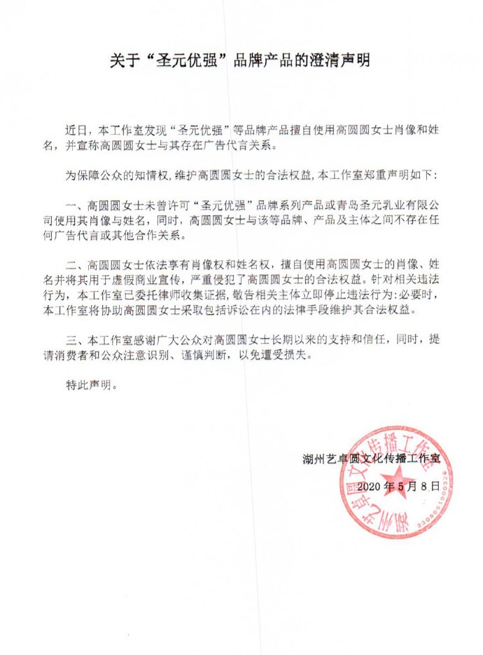 5月8日,高圆圆工作室在社交媒体平台上发布声明,称高圆圆被一家奶粉品牌利用其名称和形象权进行虚假广告,并表示将追究其法律责任。