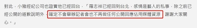 对此,罗志祥的机构回应道:“罗志祥已经返回台北。情感是艺术家的私事。除了公开道歉之外,可以肯定的是,不会举行新闻发布会,也不会有公众回应占用媒体资源。”看来罗志祥打算在风暴结束前停止出现。