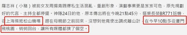 此外,罗志祥的行踪已经成为一个谜,被台湾媒体发现,他已经返回台湾的计划,移动老虎远离山区。据报道,他今晚将从上海乘飞机返回台湾。然而,事实上,今天上午10点左右,小猪从厦门飞到桃园,悄悄地回到了台湾,给所有的媒体留下了0+的分数。