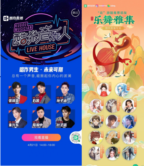 此外,新开通的在线音乐会节目“酷狗音乐家生活屋”和“音乐和舞蹈合奏”是两个更侧重于垂直音乐的节目。他们的目标是独立音乐家和古董二级粉丝。他们为歌手们提供了一个“云之旅”的舞台,在歌迷们不能正常离线表演的日子里,通过每场超过4个小时的接力演唱会,为他们现场伴奏。