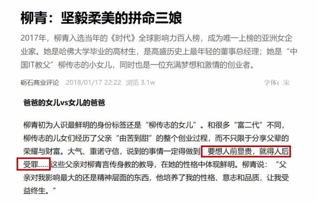 滴滴的副总裁柳青曾说过,她的父亲,中国企业家教父柳传志教给她的最重要的一句话就是:要想人前显贵,必定人后受罪。