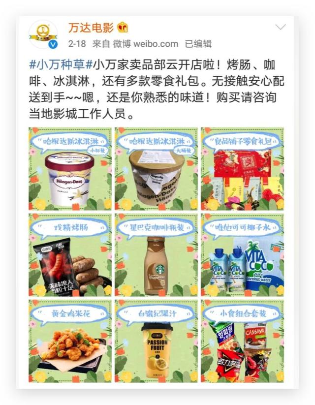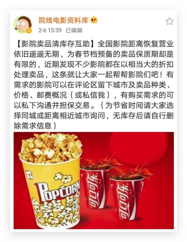 前阵子,电影大V@院线电影资料库在微博上帮忙发布了几则帮助影城清理食品库存的广告,引起了业内较大的关注。由于春节前并没有爆出疫情消息,许多影城还是照常囤了相当多的食物以在春节档期间售卖,为了弥补损失,不少影院开始了云售卖模式,通过团购、低价促销等方式处理库存。
