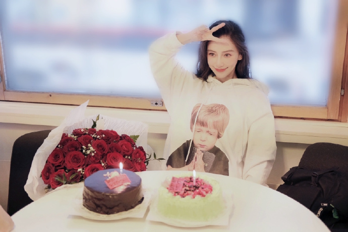 照片中,baby身旁放着玫瑰花,对镜甜笑。