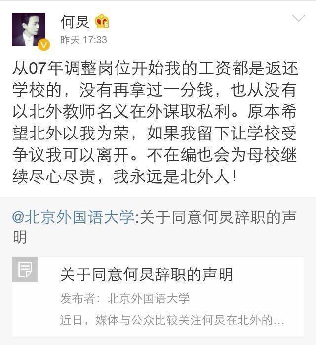 而在2015年,何炅因为两份工作引来质疑。他最终选择离开校园,阻断传闻。何炅也在社交平台回应称:“从07年调整岗位 开始我的工资都是返还学校的,没有再拿过一分钱”,“如果我留下让学校受争议我可以离开。