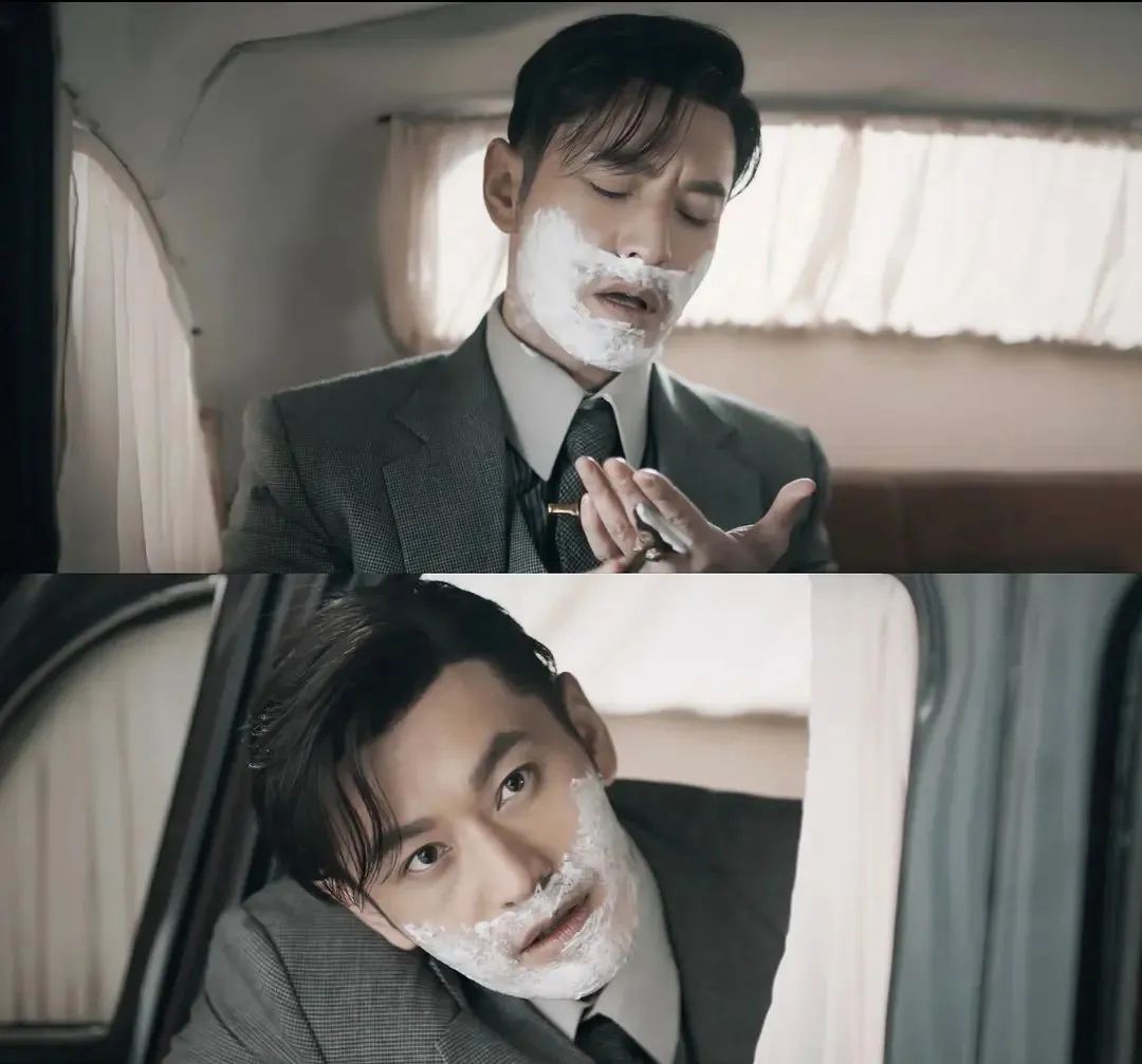 而剧中,他坐在小轿车里刮胡子是这样的,不做作,还突显出一丝贵气。