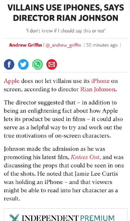 近日,《利刃出鞘》《星球大战8》导演莱恩·约翰逊在接受外国媒体采访时表示:“我不知道这能不能说出来:Apple允许你在电影里使用iPhone,但要求——在悬疑片里很关键——片中的坏人不可以用iPhone……每个片子里有要保密的坏人的电影人,现在都想杀掉我吧。”